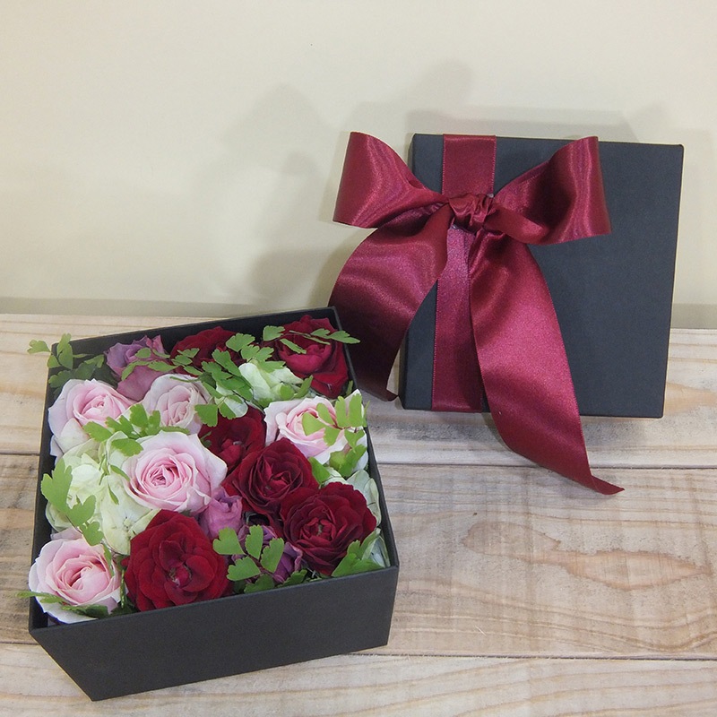 一見するとお洒落なギフトボックス。蓋を開けた瞬間に鮮やかな花々が現れるため、普通の花束以上に「わっ!」という驚きと感動を与えられます。
