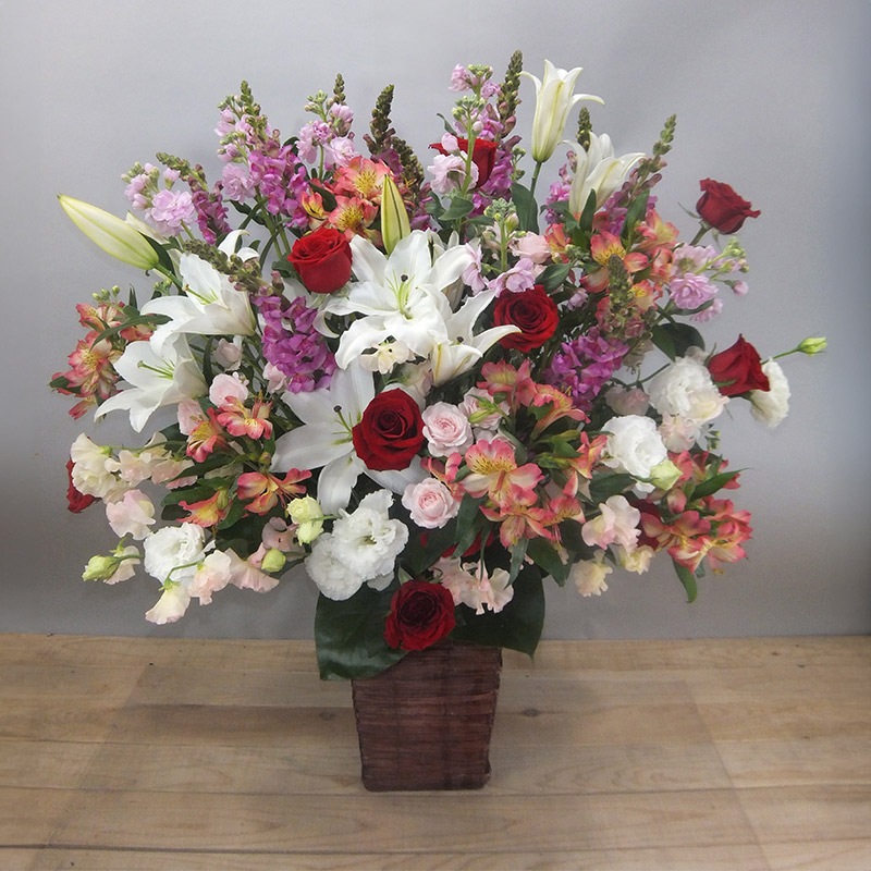 - ミックス: 色とりどりの花を使った、賑やかで楽しい雰囲気。お子様の発表会などに。