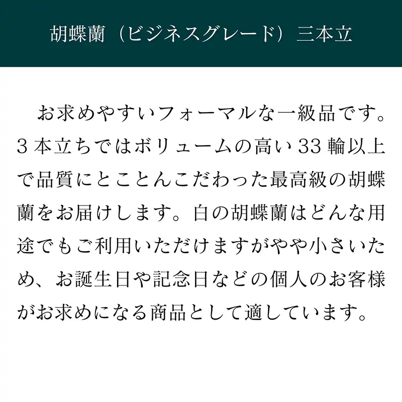 お求めやすいフォーマルな一級品です。3本立ちではボリュームの高い30輪以上で品質にとことんこだわった最高級の胡蝶蘭をお届けします。白の胡蝶蘭はどんな用途でもご利用いただけますがやや小さいため、お誕生日や記念日などの個人のお客様がお求めになる商品として適しています。